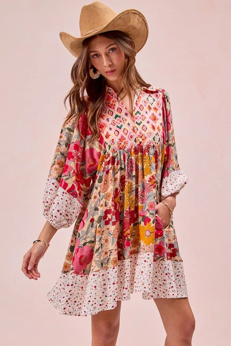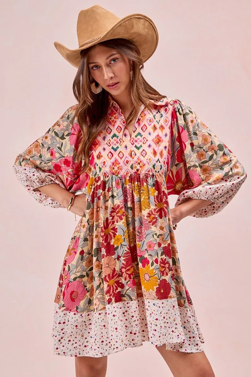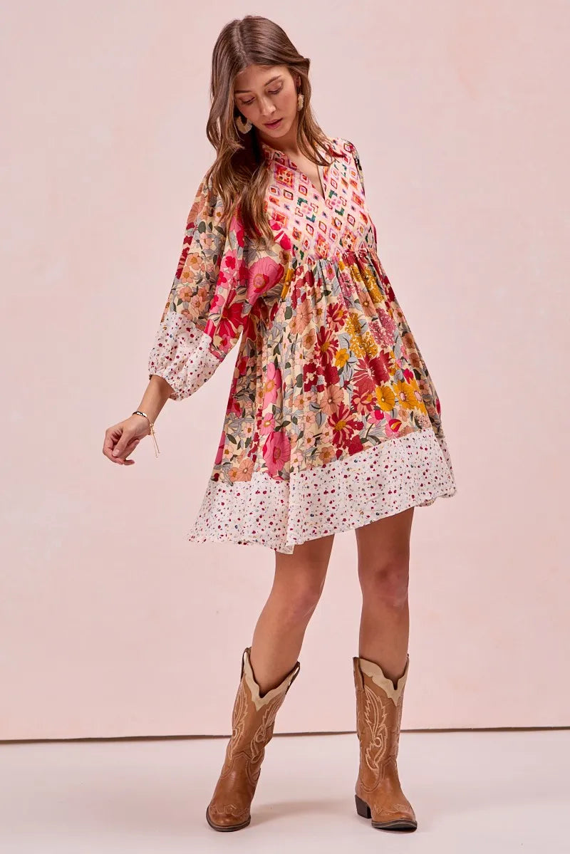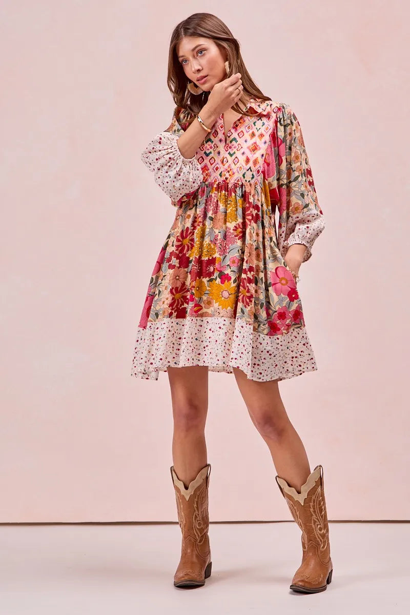 This stunning bohemian-inspired dress features a captivating mix of floral and geometric patchwork prints that create a vibrant, eye-catching design. Crafted from lightweight, flowing fabric, this dress offers ultimate comfort with its relaxed empire waist silhouette that flatters all body types. The three-quarter sleeves and knee-length cut make it perfect for transitional seasons, while the eclectic print combination showcases roses, geometric patterns, and polka dots in warm tones of pink, coral, yellow, and cream. The dress embodies effortless boho-chic style, making it ideal for casual outings, festivals, or vacation wear. The mixed-media print design ensures this piece stands out as a unique fashion statement that combines vintage charm with contemporary appeal.