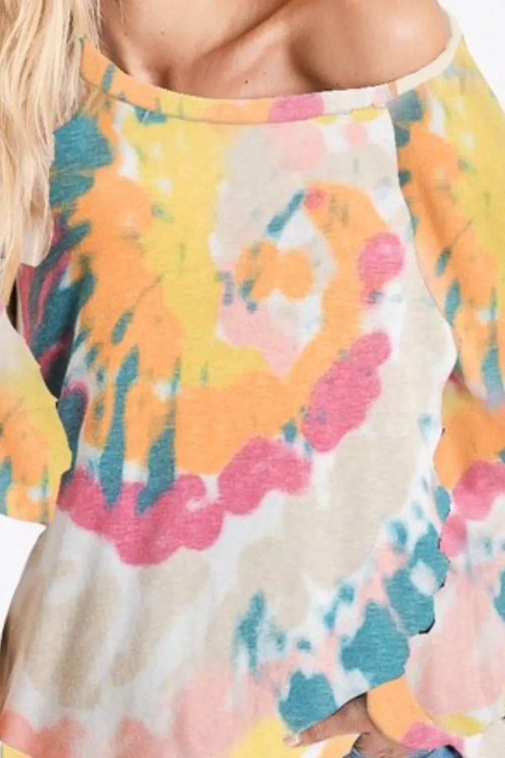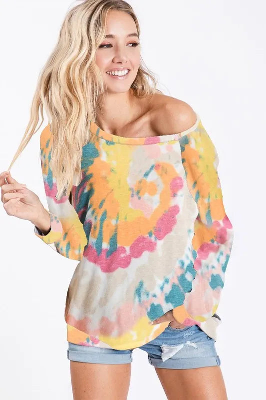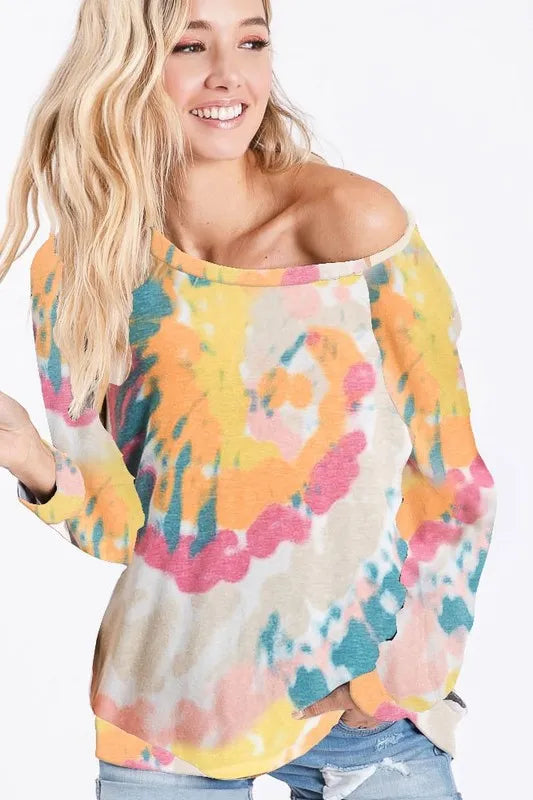 This tie-dye print knit top is a vibrant and trendy addition to your wardrobe. The tie-dye pattern adds a playful and colorful touch to the top, perfect for adding a pop of fun to your outfit. The knit fabric is soft and comfortable, making it ideal for everyday wear. Pair this top with jeans or shorts for a casual and stylish look. Stay on-trend with this chic and eye-catching tie-dye print knit top.