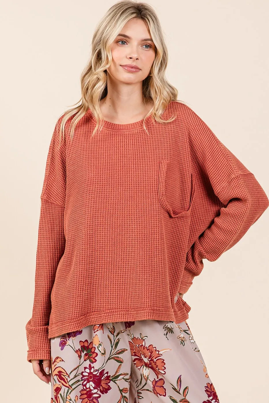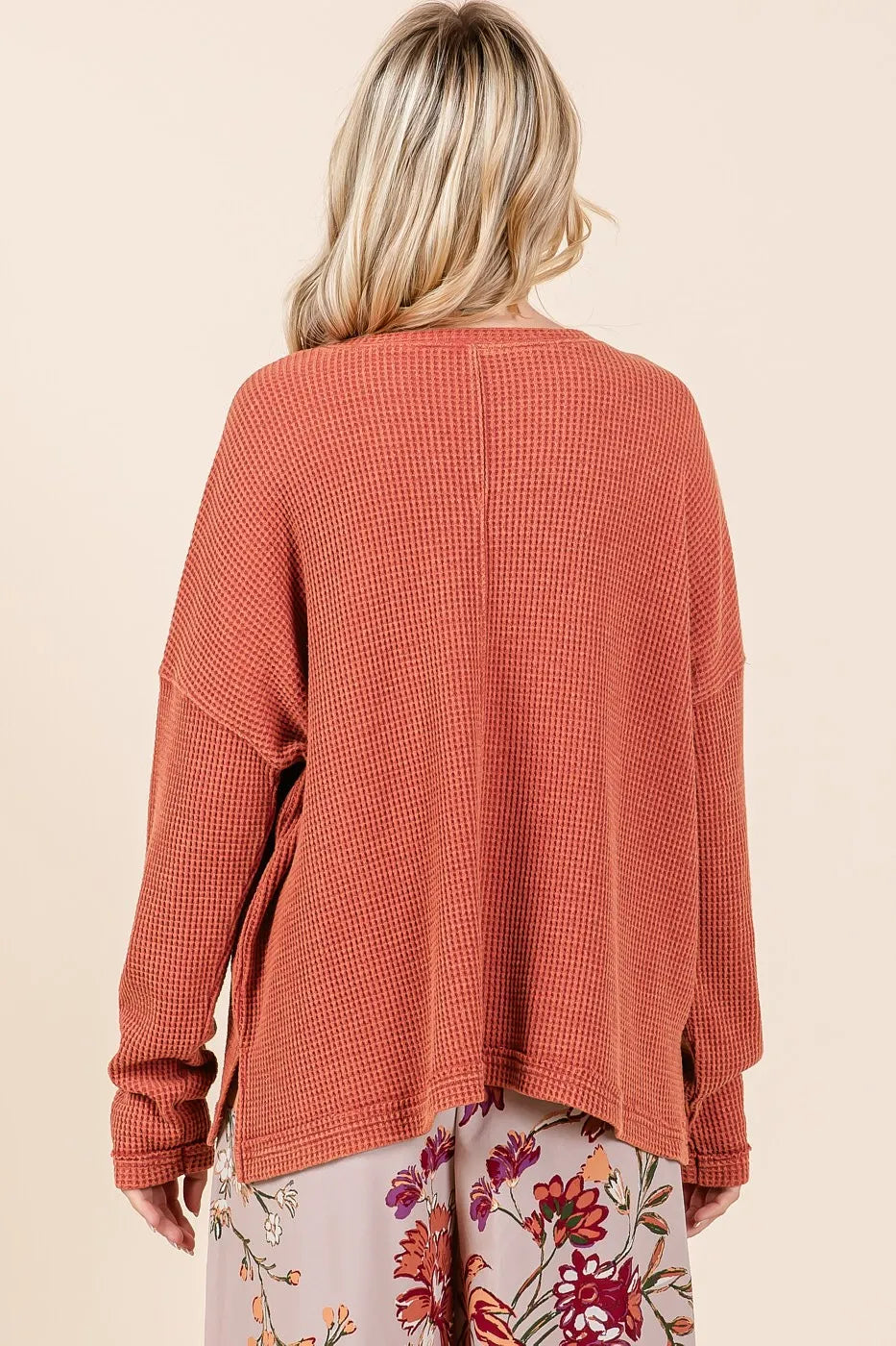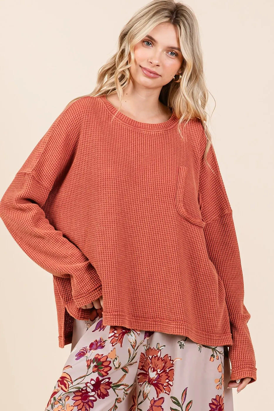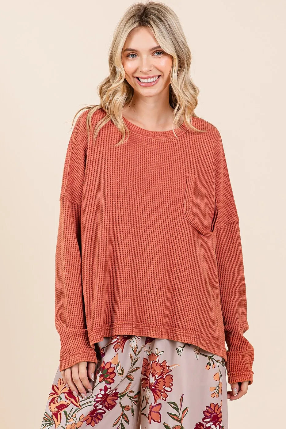 This long sleeve waffle top is crafted from mineral wash fabric and features cutout pockets for a stylish and unique touch. Perfect for adding an edgy vibe to your outfit, the mineral wash design provides a trendy look. The cutout pockets add a modern and chic detail to the top. Stay on-trend with this mineral wash cutout pocket long sleeve waffle top!