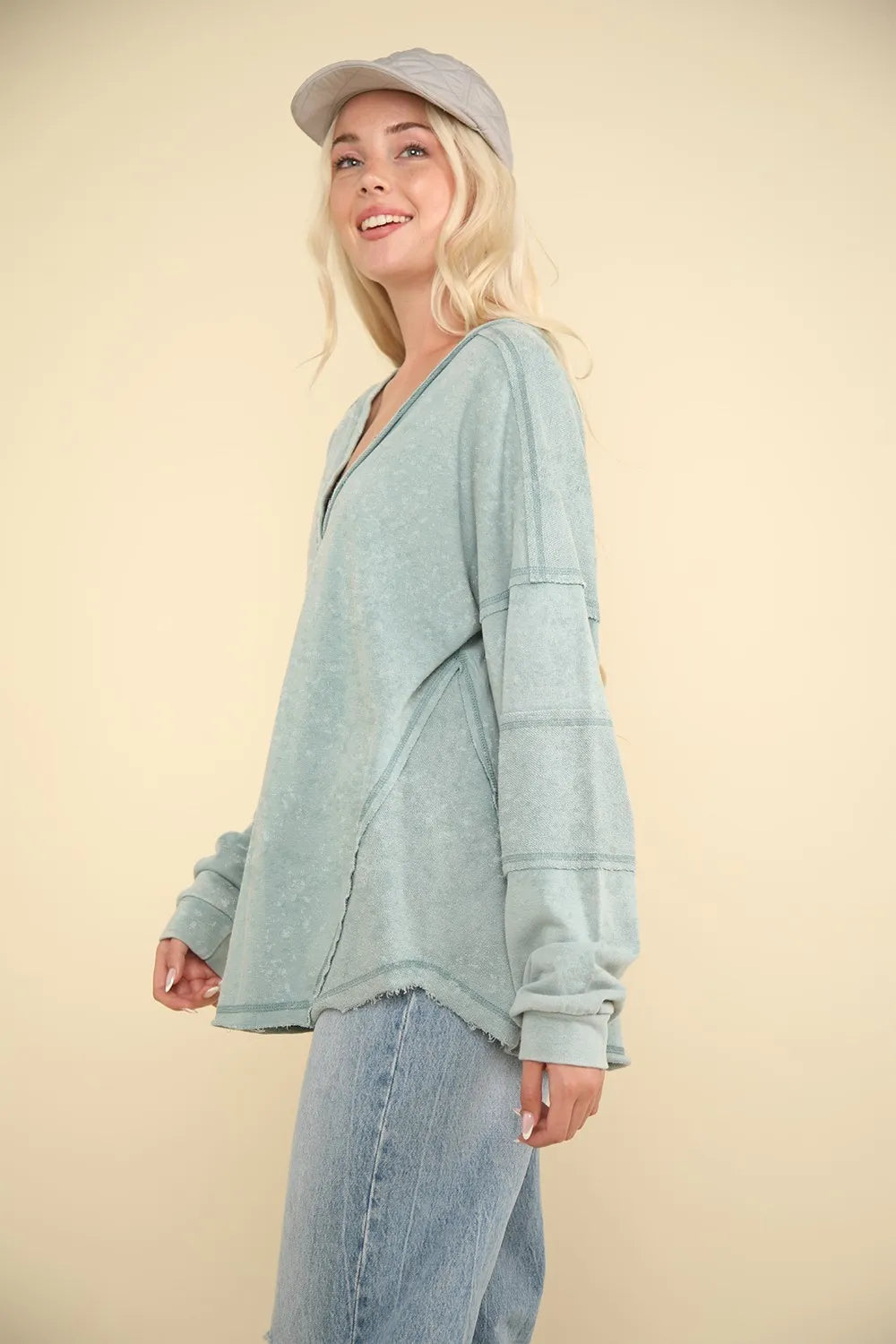 VERY J Washed V-Neck Exposed Seam Knit Top