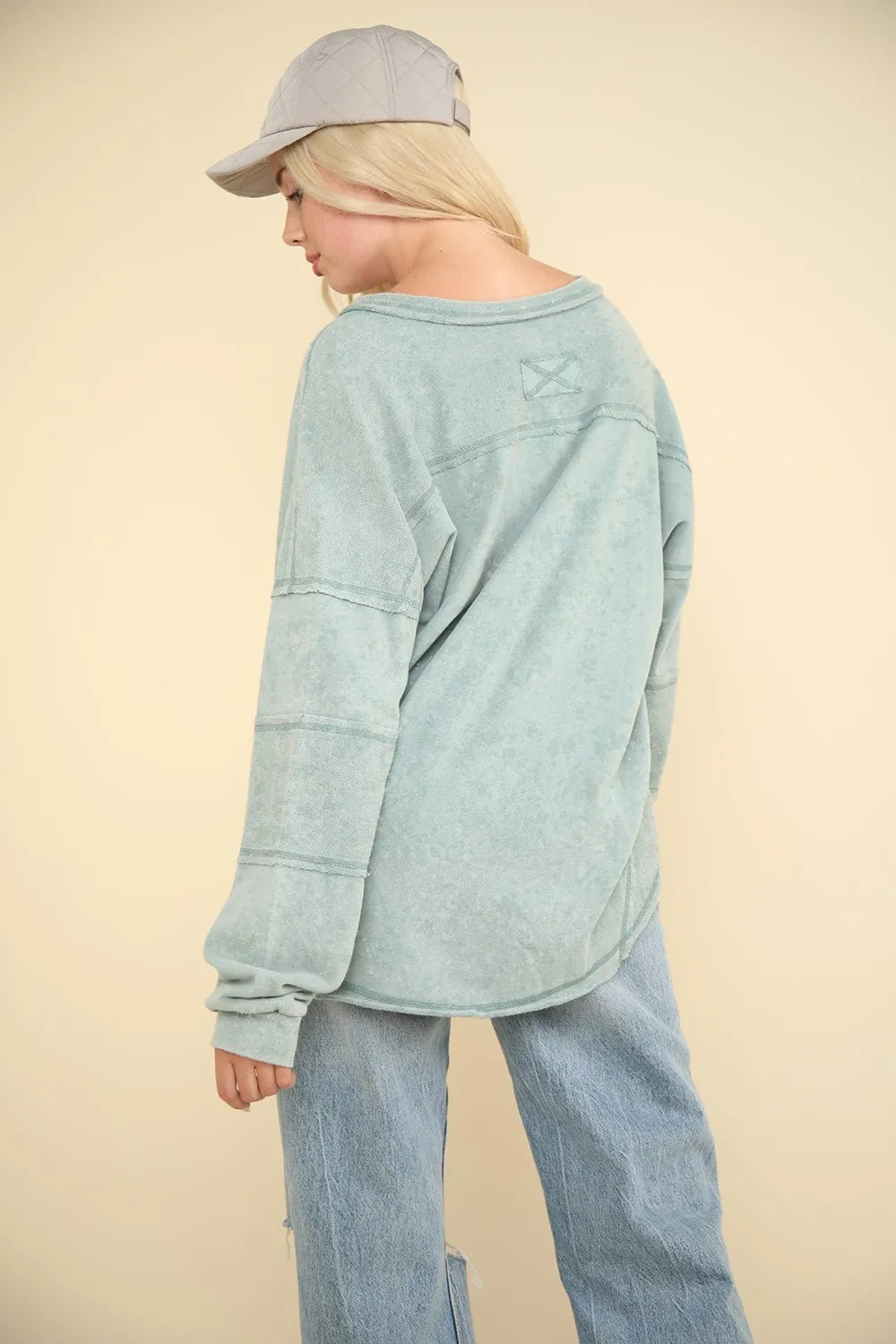 The Washed V-Neck Exposed Seam Top offers a relaxed yet stylish look with its drop shoulder design and long sleeves. The V-neck and round hem create a flattering silhouette, while the raw edge detail adds a touch of modern edge. The exposed seams and button trim provide unique, fashionable accents. Ideal for a casual day out, this top combines comfort with a trendy, laid-back vibe.