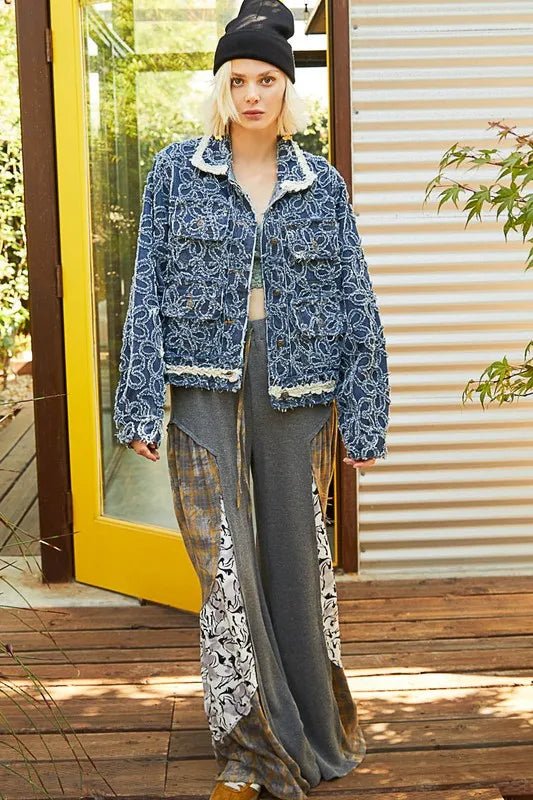 POL Flower Textured Raw Hem Long Sleeve Denim Jacket