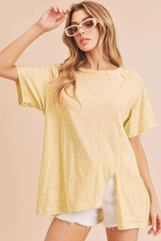 The Asymmetrical Front Slit Round Neck Raglan Sleeve T-Shirt features a stylish and modern design. With its asymmetrical front slit detail, this shirt offers a unique twist on a classic silhouette. The round neck adds a timeless touch, while the raglan sleeves provide a comfortable and sporty look. This t-shirt is versatile and can be dressed up or down depending on the occasion, making it a chic and trendy addition to your wardrobe.