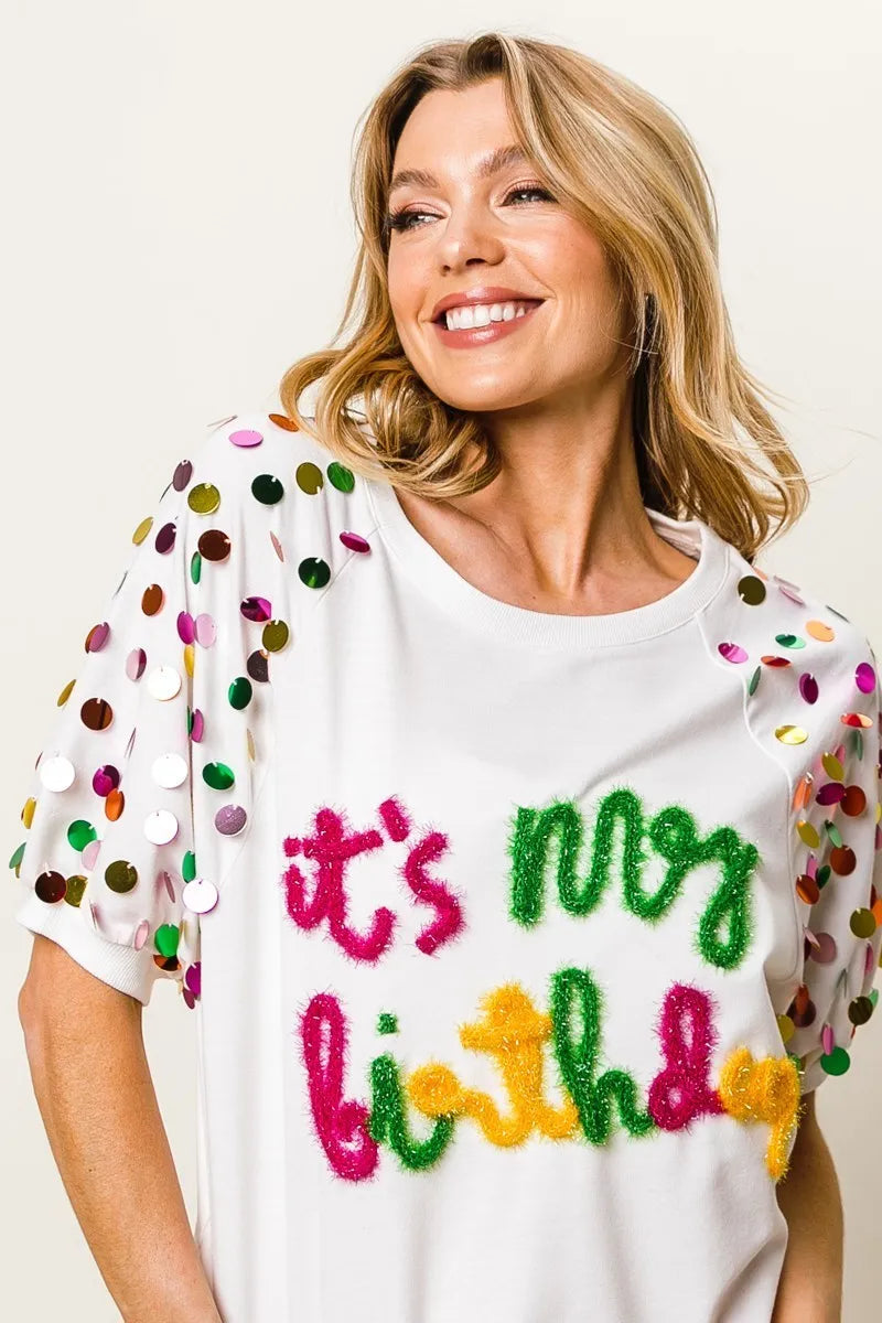 BiBi Metallic Letter Spangle Raglan Puff Sleeve Top